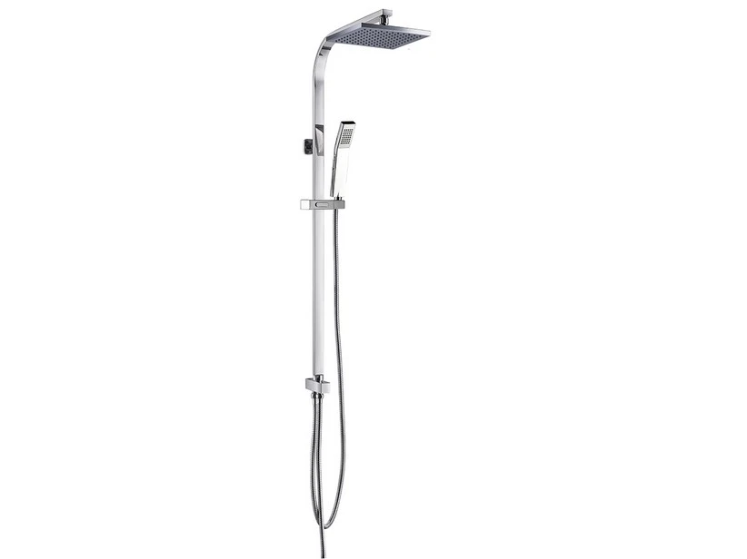 AMELIE colonna doccia design squadrato senza miscelatore – deviatore a due vie integrato a dischi ceramici in ottone – tubo asta in acciaio a sezione squadrata con arco – soffione quadrato in abs cm. 20×20 – doccetta abs monogetto – flessibile acciao antitorsione cm. 150 con finitura cromo