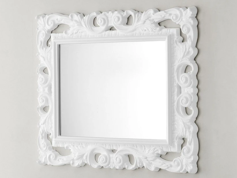 Specchio barocco cm. 94×75 cornice in pasta di legno e resina laccato bianco lucido